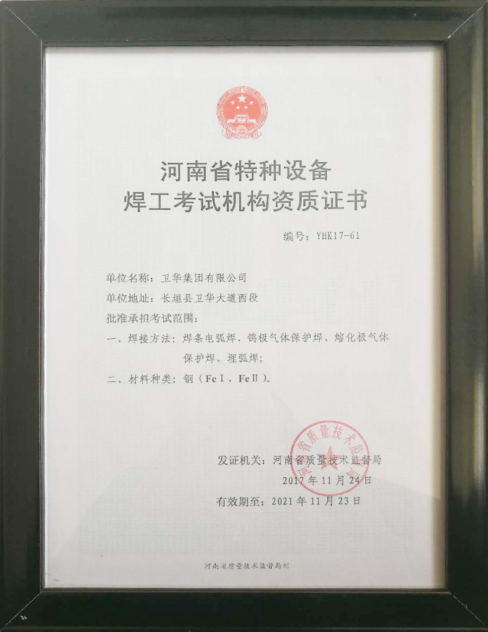 卫华集团获批河南省特种设备焊工考试机构资质